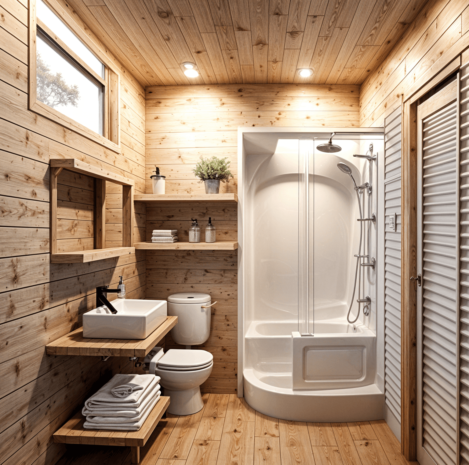 Compact fixtures, such as corner sinks and wall-mounted toilets, help optimize bathroom space. Sliding barn doors or pocket doors eliminate the need for clearance space, making them ideal for tiny homes.